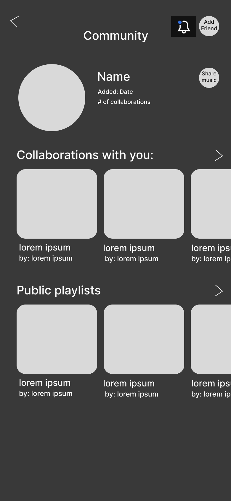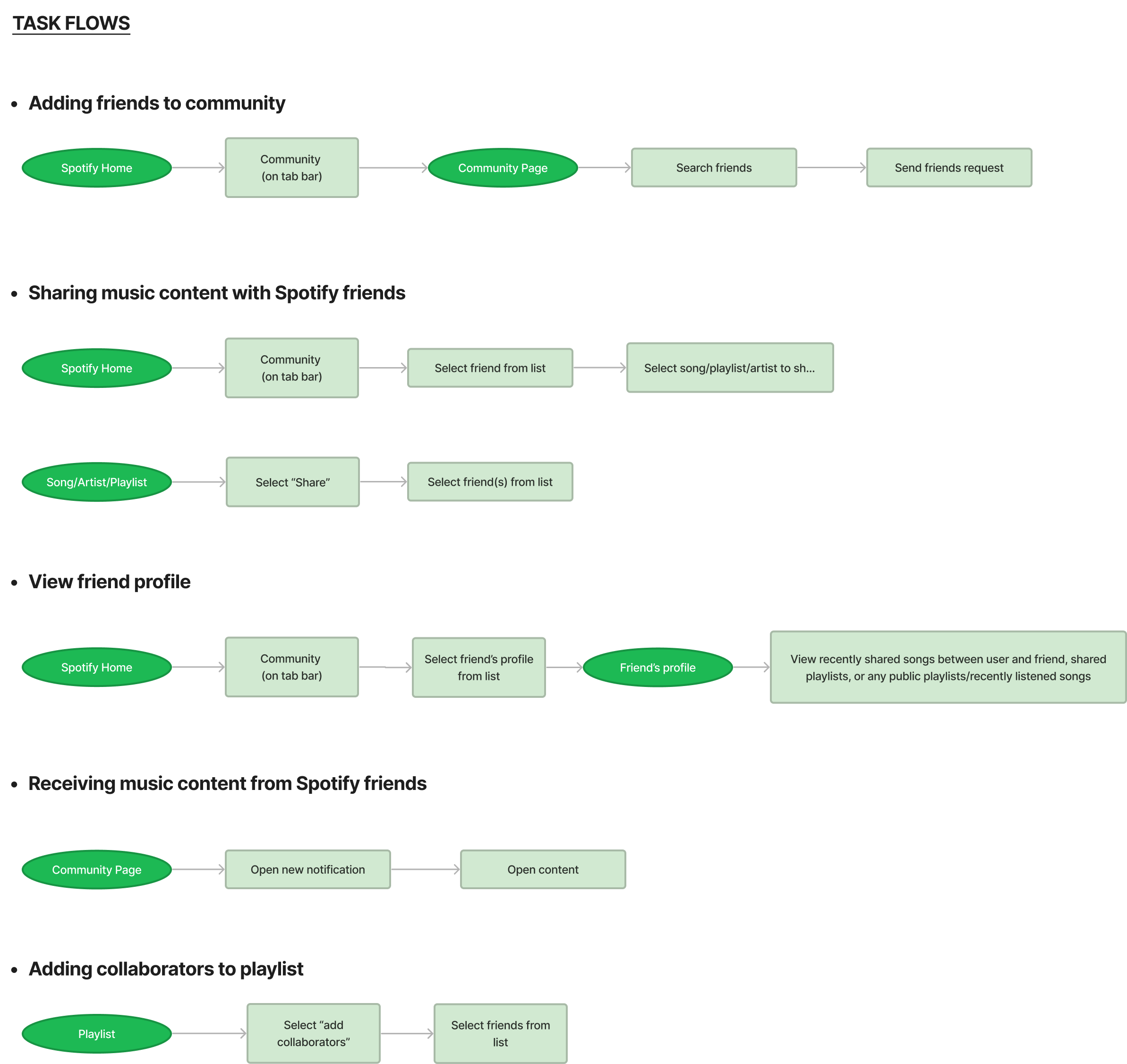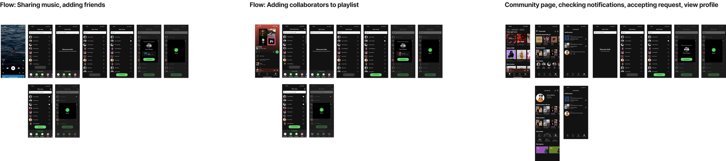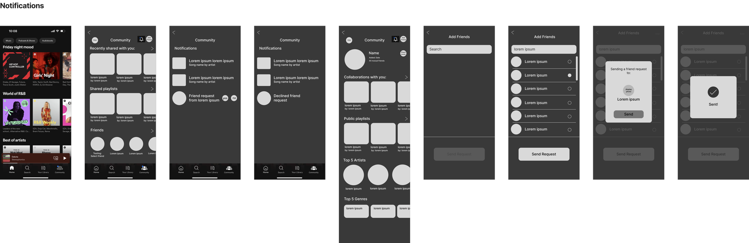 I began developing ideas for a “Community” feature on the Spotify mobile app, in which users could interact more efficiently with other Spotify users. The feature includes being able to add others as “Friends”, which would allow them to share artists, songs, as well as collaborate on playlists directly on the platform, rather than having to share it externally.
