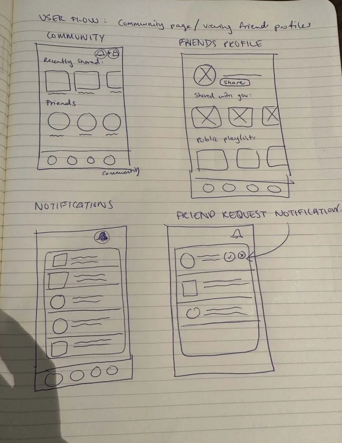 I started by sketching mobile layout ideas for the Community feature, and how the Friends list would appear when users share content or add collaborators to playlists.